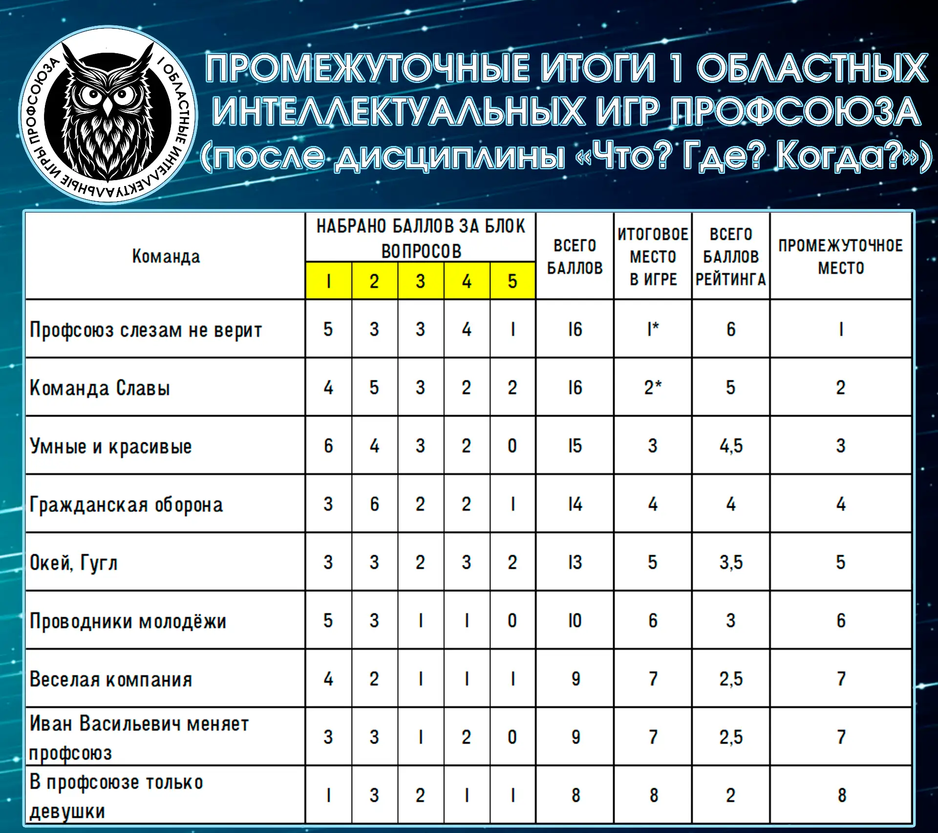 По сумме рейтинговых баллов за обе дисциплины сложилась уникальная ситуация: команды «Гражданская оборона» и «Профсоюз слезам не верит» набрали поровну. Снова всё решила дуэль, и снова победа осталась за «Профсоюзом слезам не верит» — бронзовые призёры! «Команда Славы» вновь заняла второе место, а абсолютными победителями I областных интеллектуальных игр профсоюза стали «Умные и красивые».